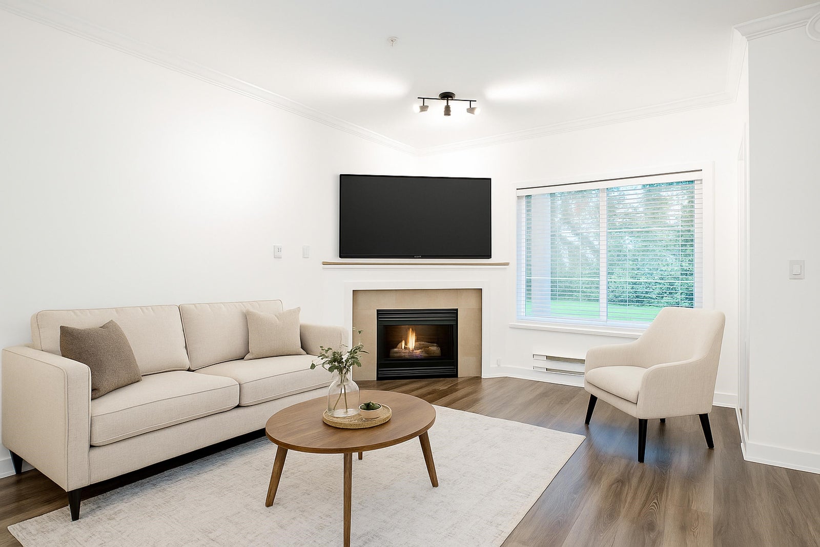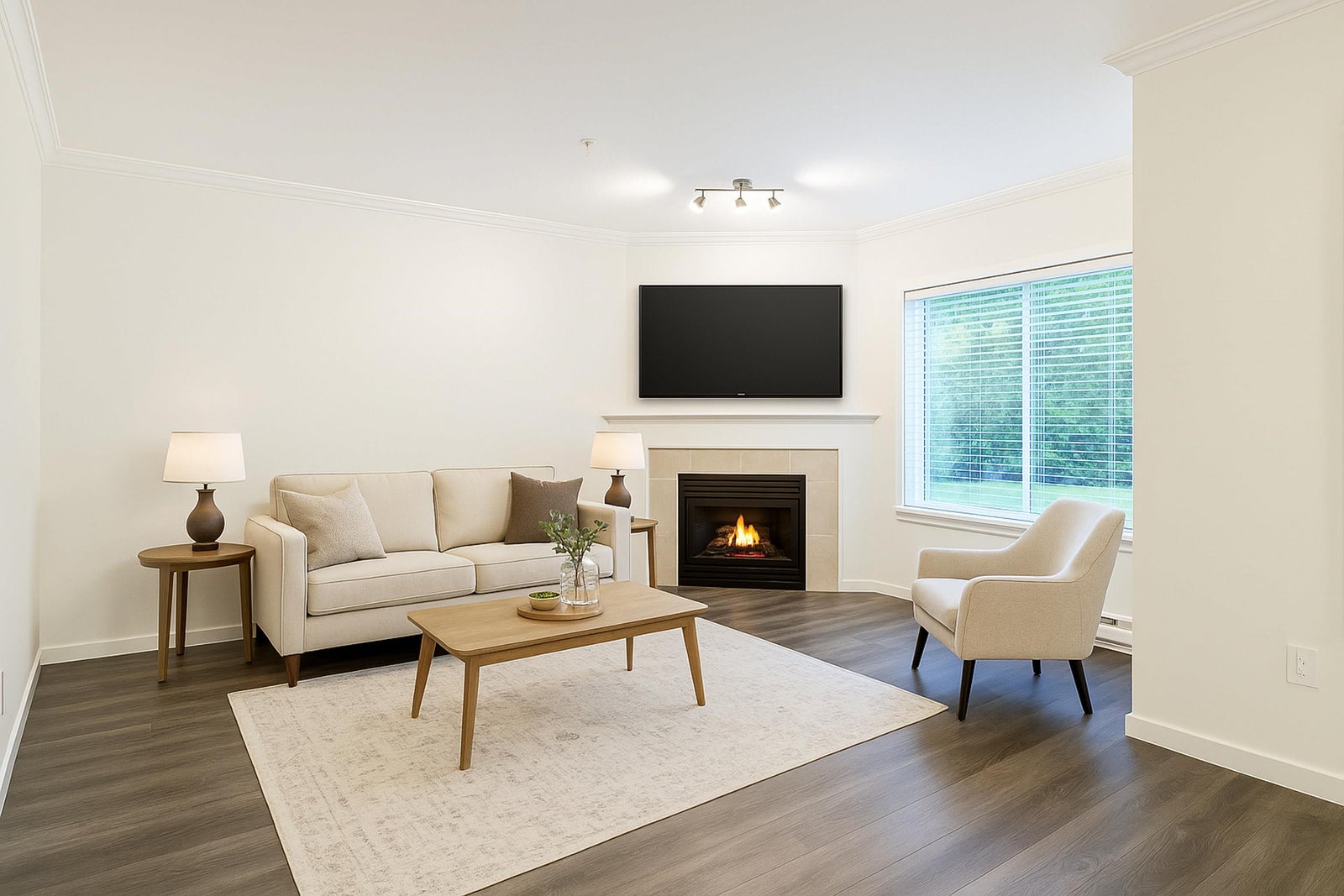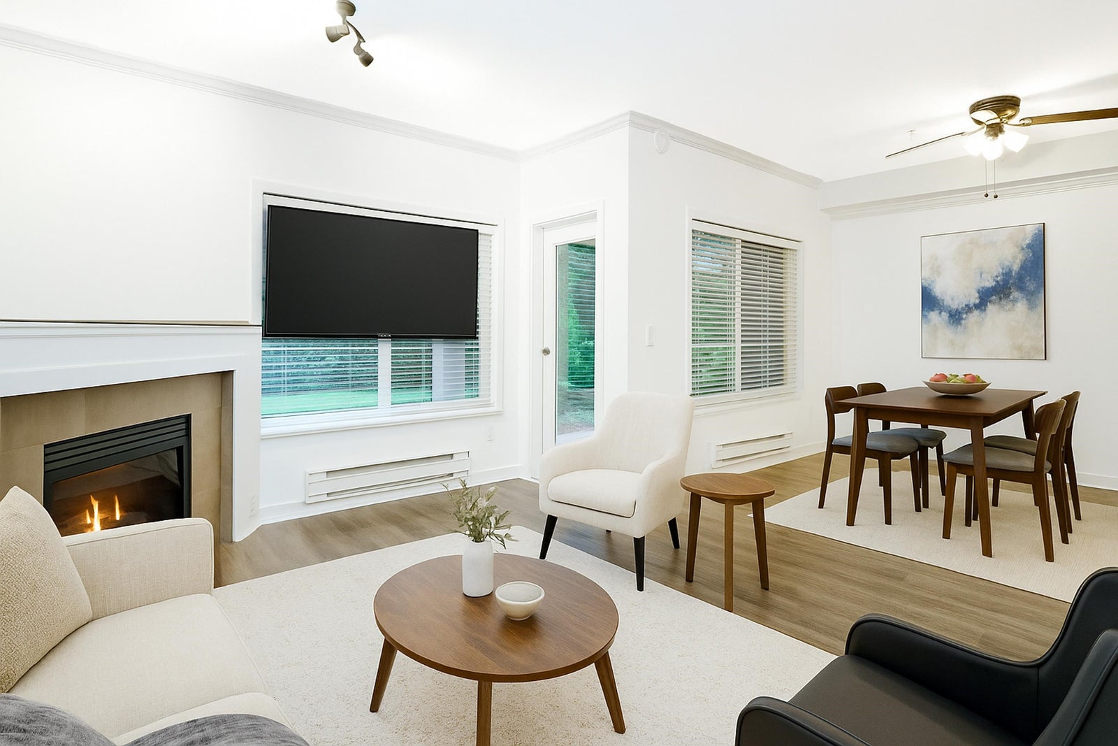 Simply Stunning Ground Floor Corner Location! Beautifully updated 2-bed, 2-bath condo in one of the best locations in the complex! This private end unit offers lush greenbelt views from nearly every window. Featuring a spacious open floor plan with 9’ ceilings, crown mouldings, new paint, flooring, carpet, and tile. The modern kitchen boasts brand new appliances and plenty of cabinetry. Relax in the bright living room with cozy gas fireplace—gas included in maintenance fee and will heat the whole home! The king-size primary bedroom offers greenbelt views, a walk-in closet, and 4-piece ensuite. A generous second bedroom and full second bath complete the layout. Enjoy direct access to a large private yard surrounded by trees and nature. Move-in ready and truly one of a kind!